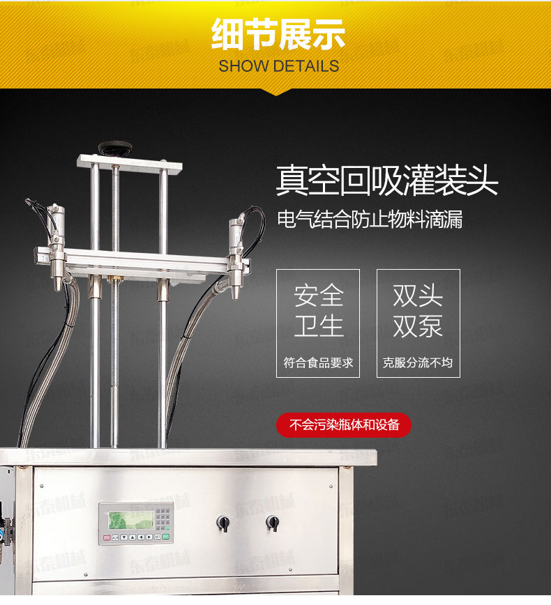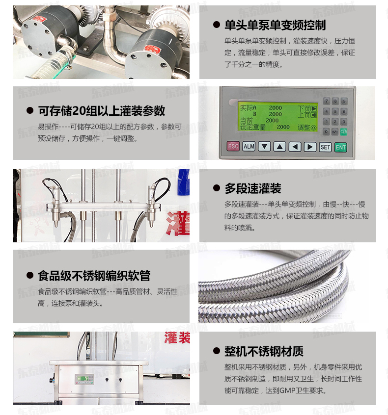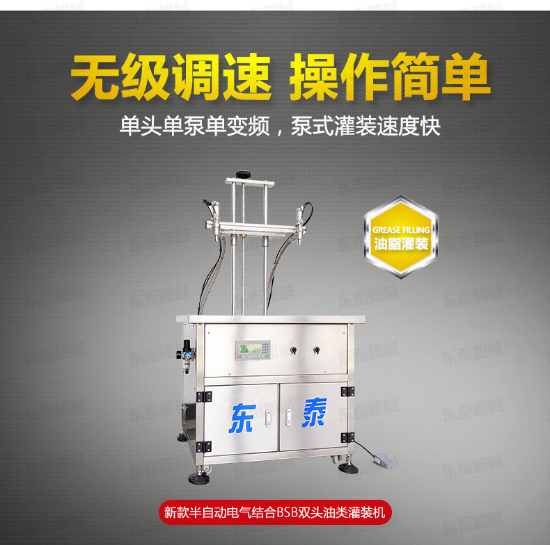 半自動(dòng)食用油灌裝機(jī)設(shè)備介紹 半自動(dòng)食用油灌裝機(jī)適用于各種食用油、潤(rùn)滑油等粘液體的定量灌裝,如花生油,大豆油,菜籽油、香油,潤(rùn)滑油等油類的灌裝。采用先進(jìn)的定量灌裝技術(shù),結(jié)合微電子智能控制技術(shù)單頭單變頻