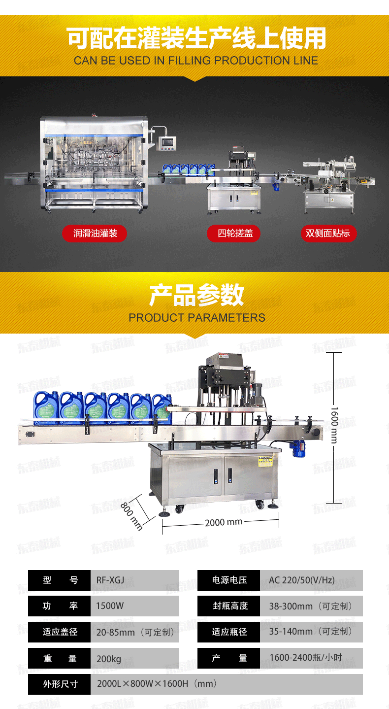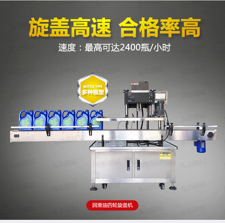 全自動旋蓋機(jī)是參照國機(jī)型改進(jìn)設(shè)計(jì)、旋蓋速度快,合格率高、操作方便。可適用于食品、制藥、日化、農(nóng)藥、化妝品等行業(yè)的不同瓶形的旋蓋。四臺調(diào)速電機(jī)分別用于供蓋、夾瓶、傳送、旋蓋,機(jī)器自動化程度高,穩(wěn)定性好,調(diào)節(jié)方便,更換瓶形或蓋時(shí)無須備件,只需作調(diào)整即可完成(如配上蓋機(jī),可進(jìn)行自動上蓋)可以根據(jù)實(shí)際需要選配。