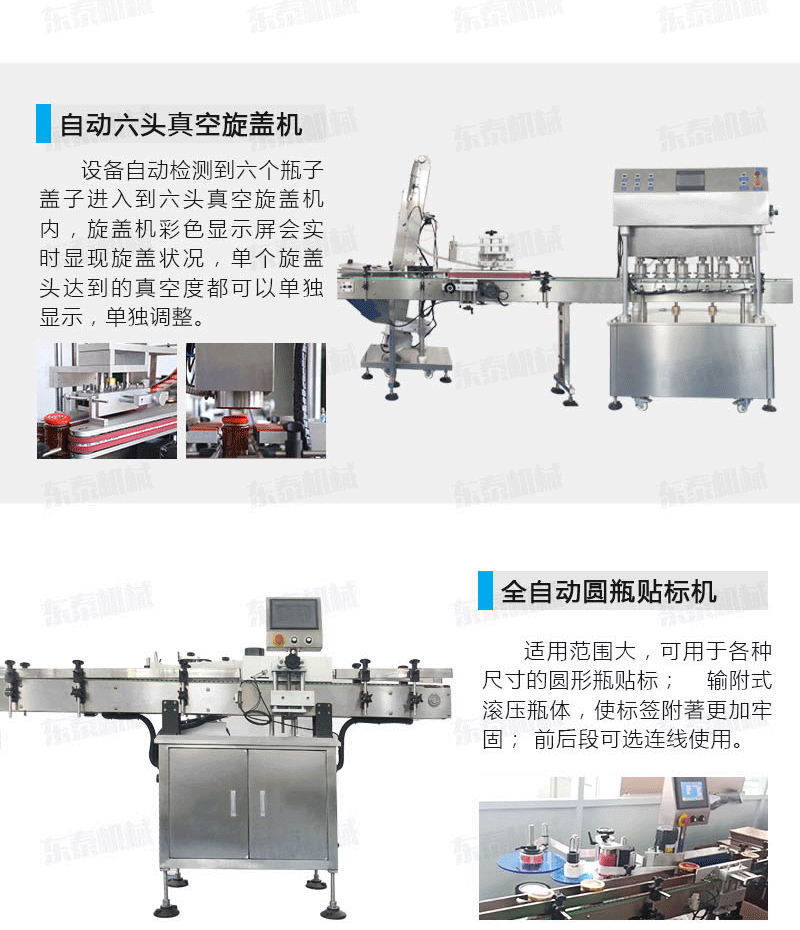 番茄醬灌裝旋蓋生產(chǎn)設(shè)備組成: 自動供瓶機+全自動滾筒洗瓶機+自動六米烘干機+自動收瓶機+全自動六頭灌裝機自動灌裝+全自動提蓋機自動理蓋、提蓋、掛蓋+六頭真空旋蓋機同時六個頭真空旋蓋+套標(biāo)機+收縮