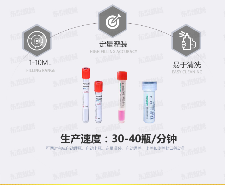設(shè)備簡介: 本機(jī)是在引進(jìn)和吸收國外技術(shù)的基礎(chǔ)上,由我公司自主研發(fā)的一款I(lǐng)VD診斷試劑灌裝旋蓋一體機(jī),能同時完成自動理瓶、自動上瓶、定量灌裝、自動理蓋、上蓋和旋蓋封口等動作。本機(jī)采用日本高