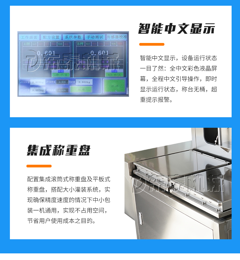 5. 該設(shè)備配備四頭(大小兩組)雙泵,凈重/毛重、自動/手動功能一鍵切換,進(jìn)一步滿足客戶精度,速度,低投資需求。