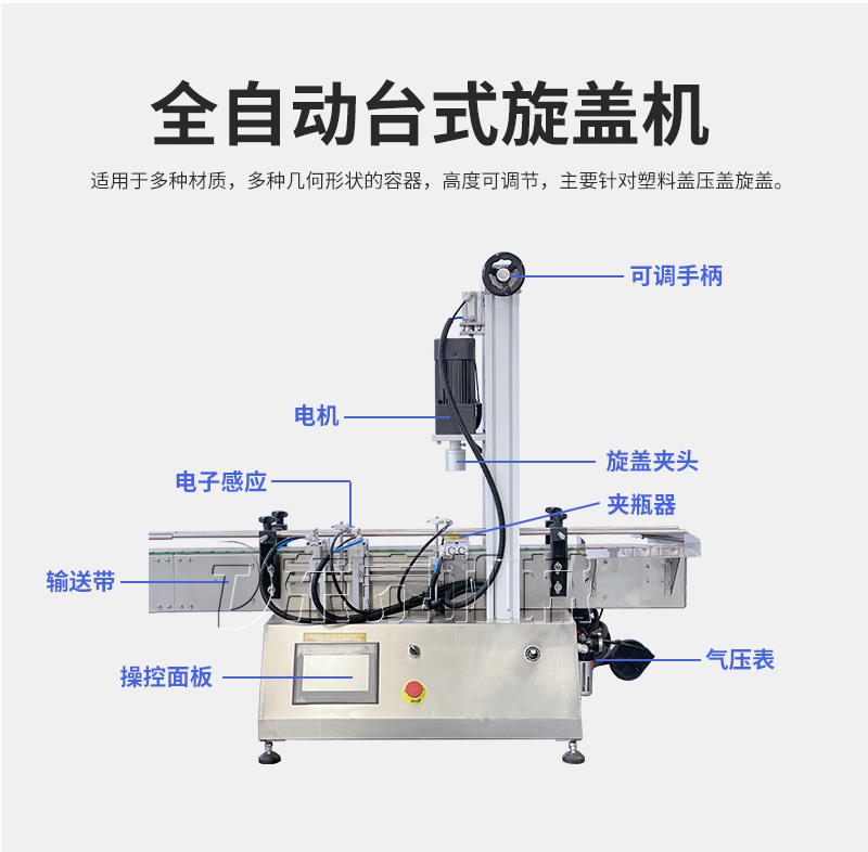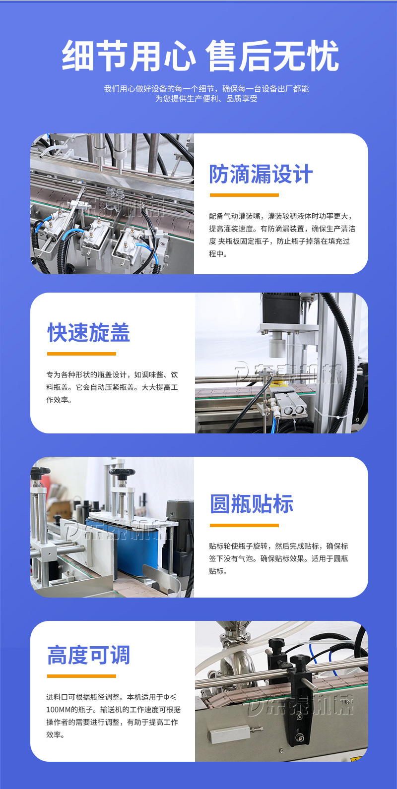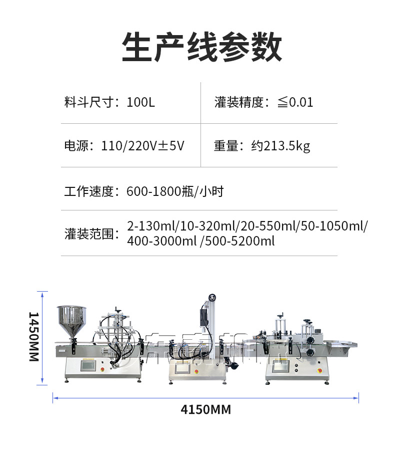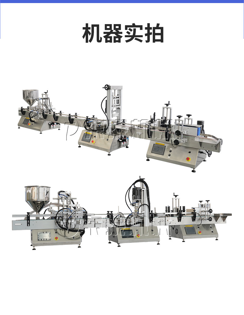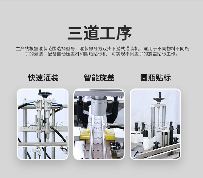 產(chǎn)品說明:生產(chǎn)線根據(jù)灌裝范圍選擇型號,灌裝部分為雙頭下潛式灌裝機(jī),適用于不同物料不同瓶子的灌裝,配備自動(dòng)壓蓋機(jī)和圓瓶貼標(biāo)機(jī),可實(shí)現(xiàn)不同蓋子的旋蓋貼標(biāo)工作。