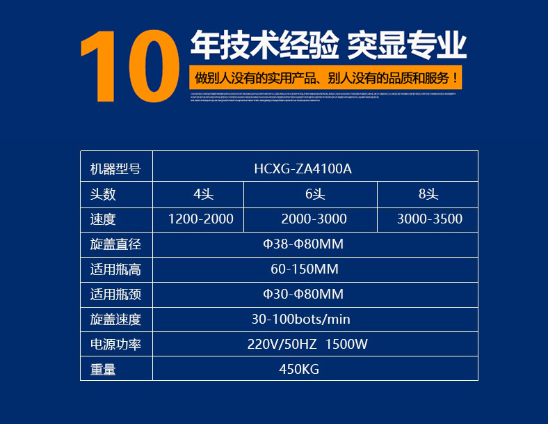 產(chǎn)品技術參數(shù) 機器型號:HCXG-ZA4100A 頭數(shù):2 速度:1200-2000次/時 旋蓋直徑:38-80mm 適用瓶高:60-150mm 適用瓶頸:30-80mm 旋蓋速度:30